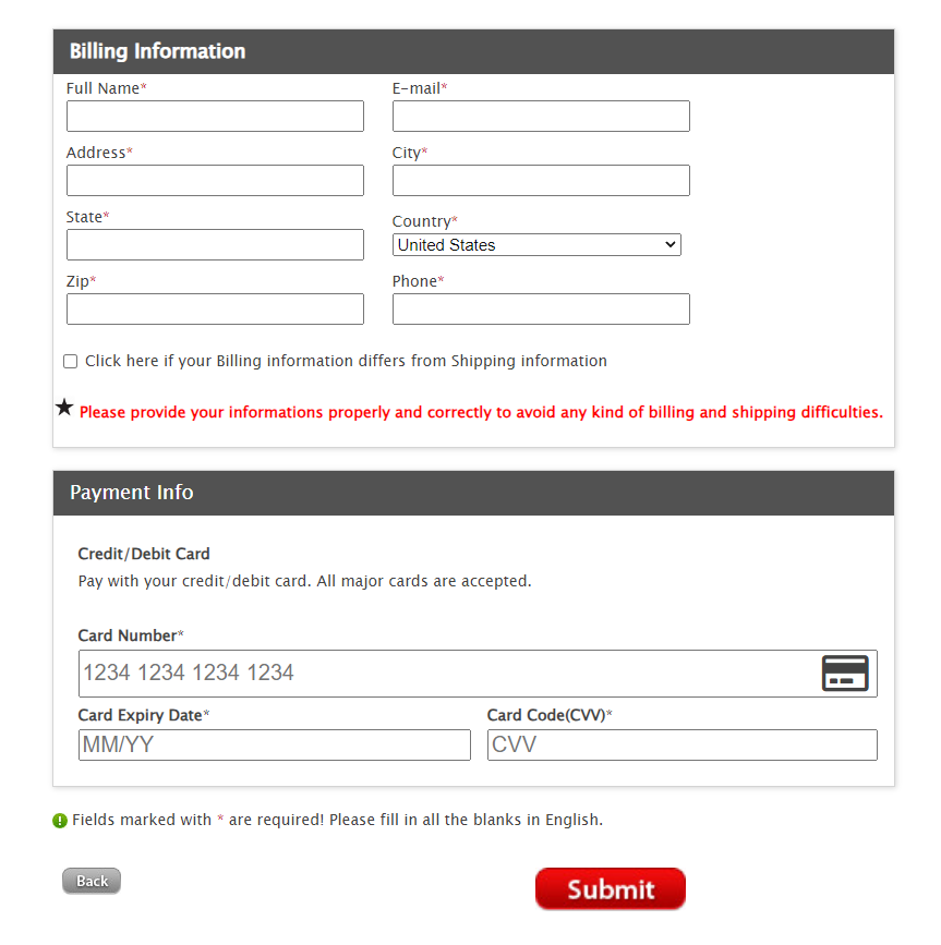 At the Checkout page please choose the delivery method — Regular Airmail or Express Courier delivery via USPS. Then put your basic information (Billing/Shipping) in the required fields. Then fillup the Credit/Debit Card information in the payment info section. Once you have completed all the required fields then click on «Submit». Your order will be successfully completed in case your payment details successfully passed through and it will show you on the screen right away. Once your order is successful you will receive an order confirmation e-mail from us.
